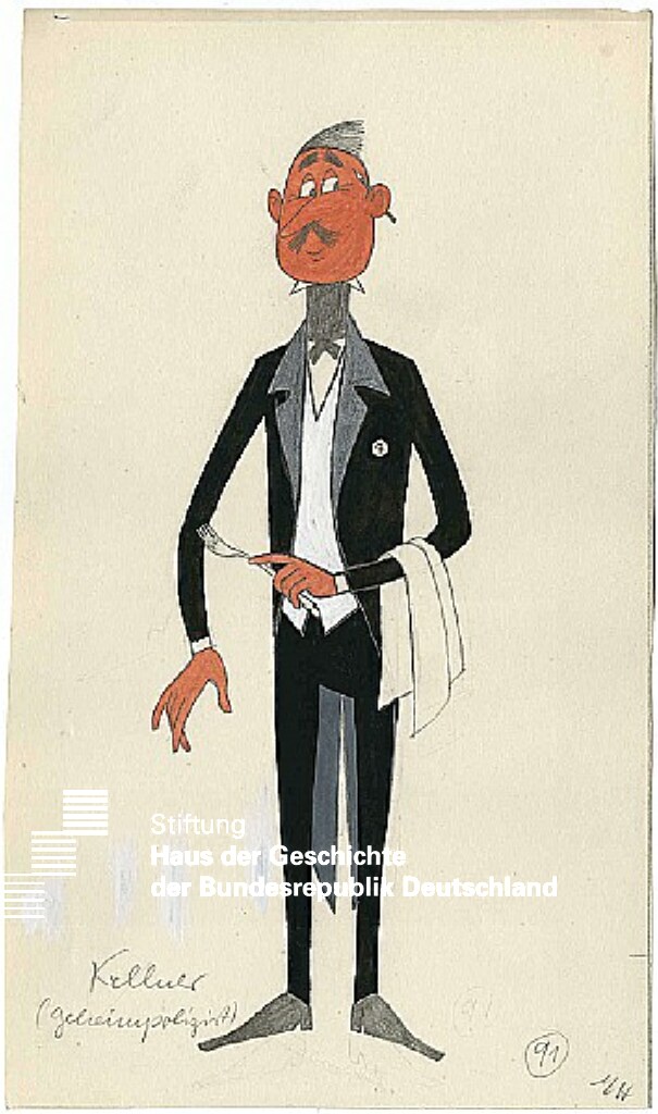Die Figurine der Figur wurde 1963/64 von Edith Hegenbarth gezeichnet und ist im Archiv des ZFL vorhanden: kolorierte Bleistiftzeichnung "Kellner (Geheimpolizist)".